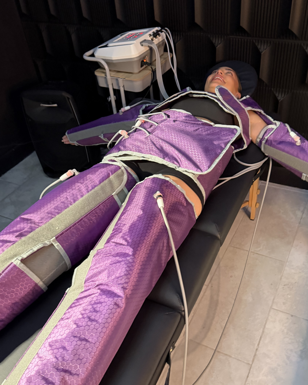 Compression bodysuit therapy uses rhythmic air pressure to gently massage the body, stimulating lymphatic drainage, improving circulation, and relieving muscle tension — all while you relax.